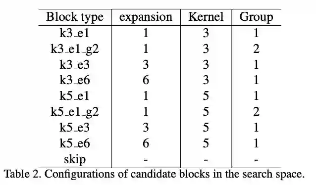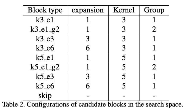 论文的实验包含9种候选block,每种block的超参数如表2所示。另外,还有skip结构,直接映射输入到输出,用来缩短整体网络的深度。总体而言,整体网络包含22个需要搜索的层,每层从9个候选block中选择,共有 种可能的结构。