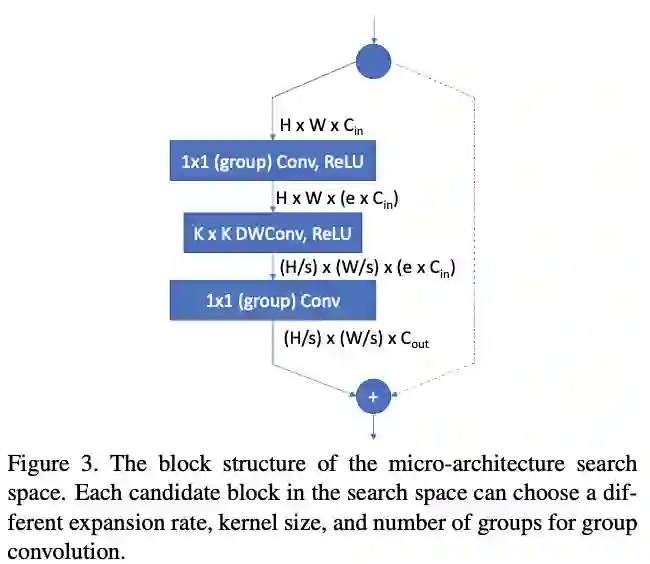layer-wise搜索空间如图3所示,基于MobileNetV2和ShuffleNet的经典结构设计,通过设定不同的卷积核大小 (3或5)、扩展率 以及分组数来构造成不同的候选block。若block的输入和输出分辨率一致,则添加element-wise的shortcut,而若使用了分组卷积,则需要对卷积输出进行channel shuffle。
