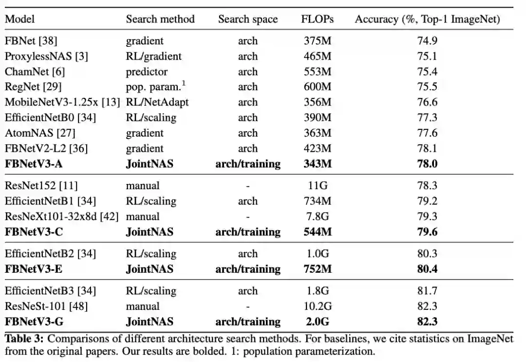 FBNetV3目前只放在了arxiv上,论文认为目前的NAS方法大都只满足网络结构的搜索,而没有在意网络性能验证时的训练参数的设置是否合适,这可能导致模型性能下降。为此,论文提出JointNAS,在资源约束的情况下,搜索最准确的训练参数以及网络结构。