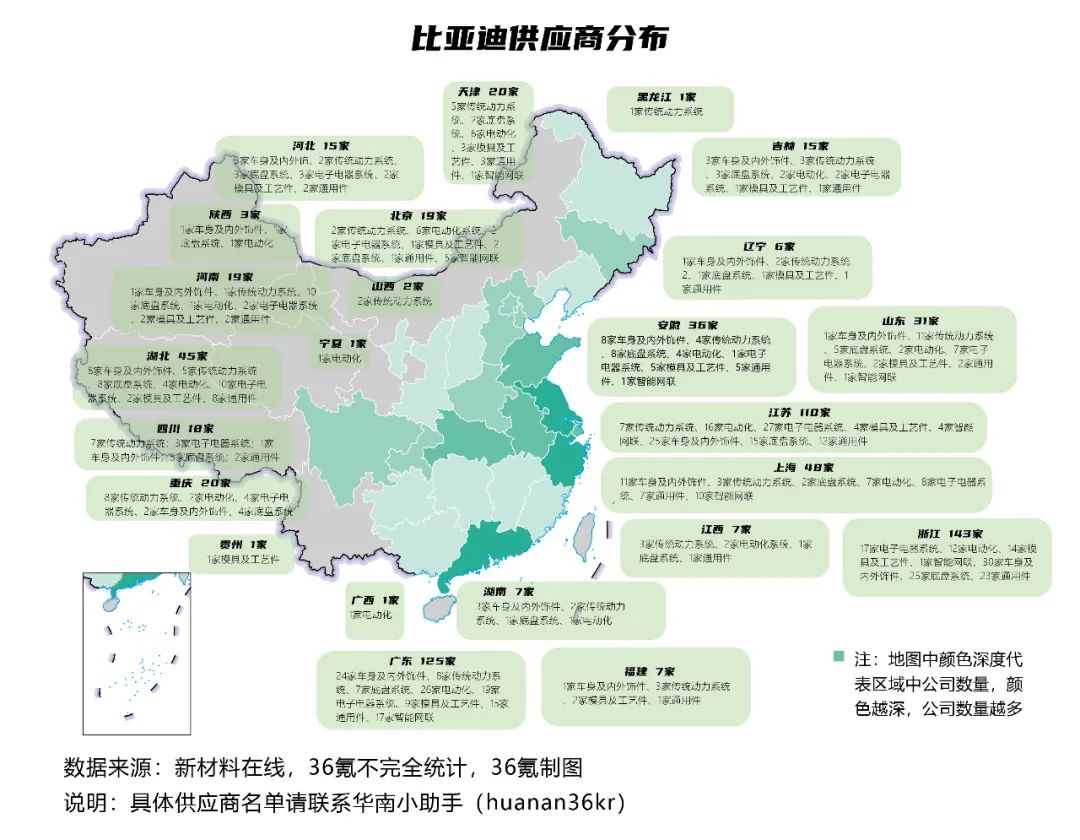 虽然比亚迪的零部件遍布全国,但主要产地仍以珠三角和长三角为主。在广东省,有125家比亚迪供应商企业,浙江省和江苏省分别有143家和110家。分布状态也较为平均,广东省占比最多的企业为电动化类、车身及内外饰件类、电子电器系统类和智能网联类企业;