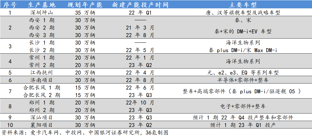 拆分来看,这10大分别位于深圳、西安、长沙、常州、抚州、济南、郑州、深汕、襄阳和合肥。其中,深圳坪山工厂为比亚迪汉+唐两款车型的生产基地,按照2021年的数据,月产能约为2-2.2万辆,全年原有产能为20万辆。不过,目前深圳基地正在扩产中,预计全年可以新增15万辆的规划产能,合计为35万辆;