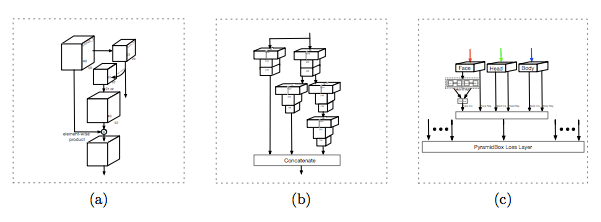 图 2:(a) 特征金字塔网络。(b) 语境敏感的预测模块。(c)PyramidBox 损失。