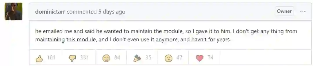 然而不怕神一般的对手,就怕“小猪佩奇”一样的队友。数月前,在 GitHub 上这个库的维护者@dominictarr 因为缺乏时间和兴趣无法继续维护这个库了,于是就将该库转让给了一个完全不认识却又想要维护的陌生人@right9ctrl ,接而不少开发者的噩梦就此开始了。