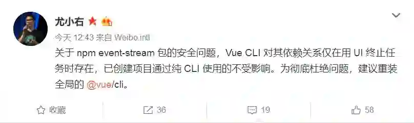 与此同时,对于不少网友反映的前端主流框架 Vue 的 Vue-cli 中也使用了 event-stream 这个依赖问题,今天 Vue 作者尤雨溪(微博@尤小右)在微博回应表示: