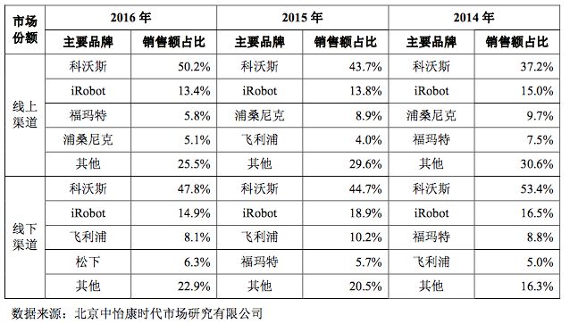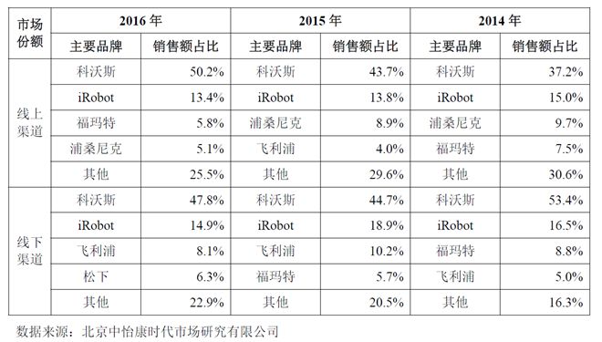 2014年起,家庭服务机器人业务逐步替代此前以代工产品为主的清洁类小家电业务,成为科沃斯的主要收入来源。无论是在线上线下渠道,科沃斯都占据了主导。中怡康数据显示,2016年,科沃斯在国内线上、线下渠道的销售额占比高达50.2%、47.8%。