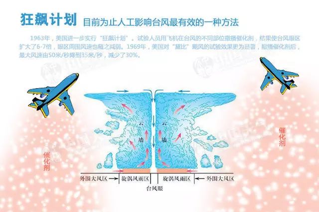 1963年,美国进一步实行“狂飙计划”。试验人员根据“角动量守恒定律”,用飞机在台风的不同部位撒播碘化银、干冰、尿素、水滴等催化剂,结果使台风眼区扩大了6-7倍,眼区周围风速也随之减弱。1969年8月18日,美国对“黛比”飓风的试验效果更为显著,撒播催化剂后,最大风速由50米/秒降到35米/秒,减少了30%。