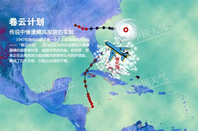 1946年,曾获诺贝尔化学奖的科学家欧文·朗缪尔提出,用飞机在台风适当部位大量播撒碘化银等催化剂,使台风内部的能量重新分布,以减弱台风的风速。在他的说服下,1947年,美国通用、美国陆军通信兵、美国空军和美国海军合作进行了第一个人工影响飓风的实验——“卷云计划”。但结果,受人工影响,原本正在远离美国大陆的飓风突然转头向西,并在佐治亚州和南卡罗来纳州登陆。这酿成了巨大灾祸,引起了公众的强烈不满。