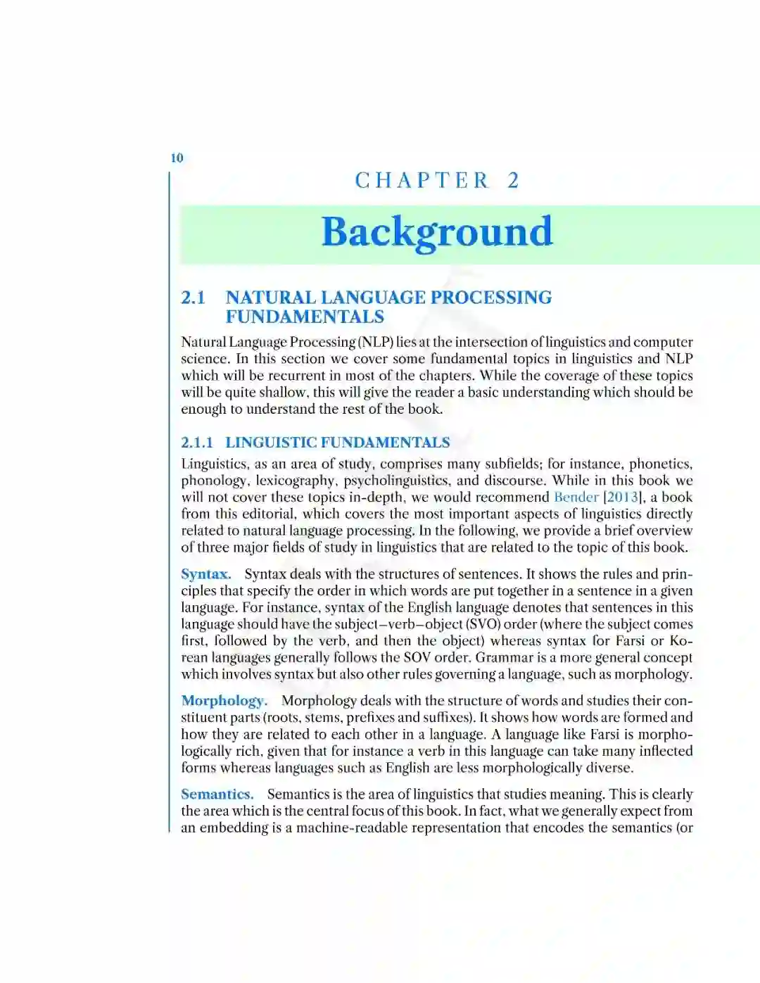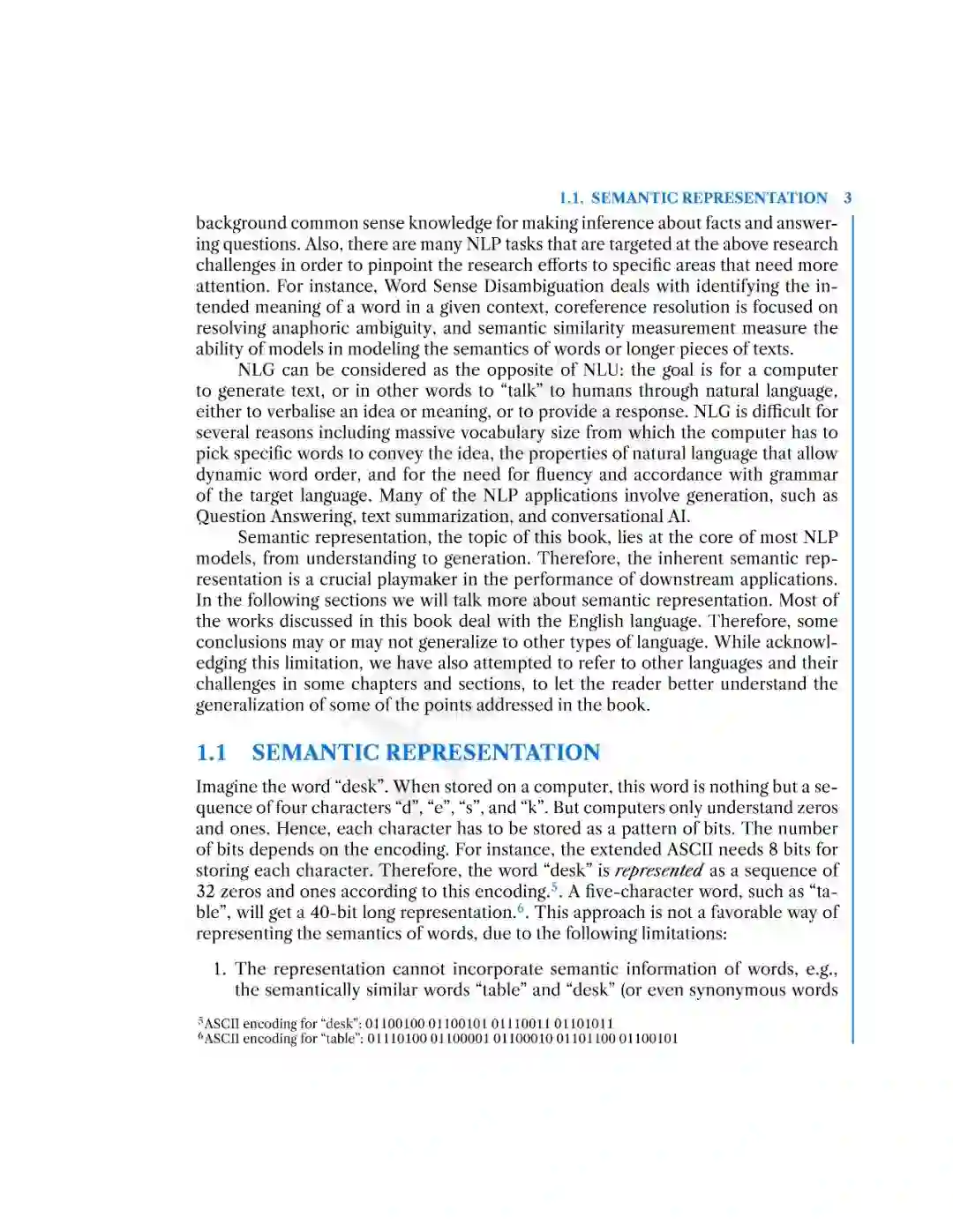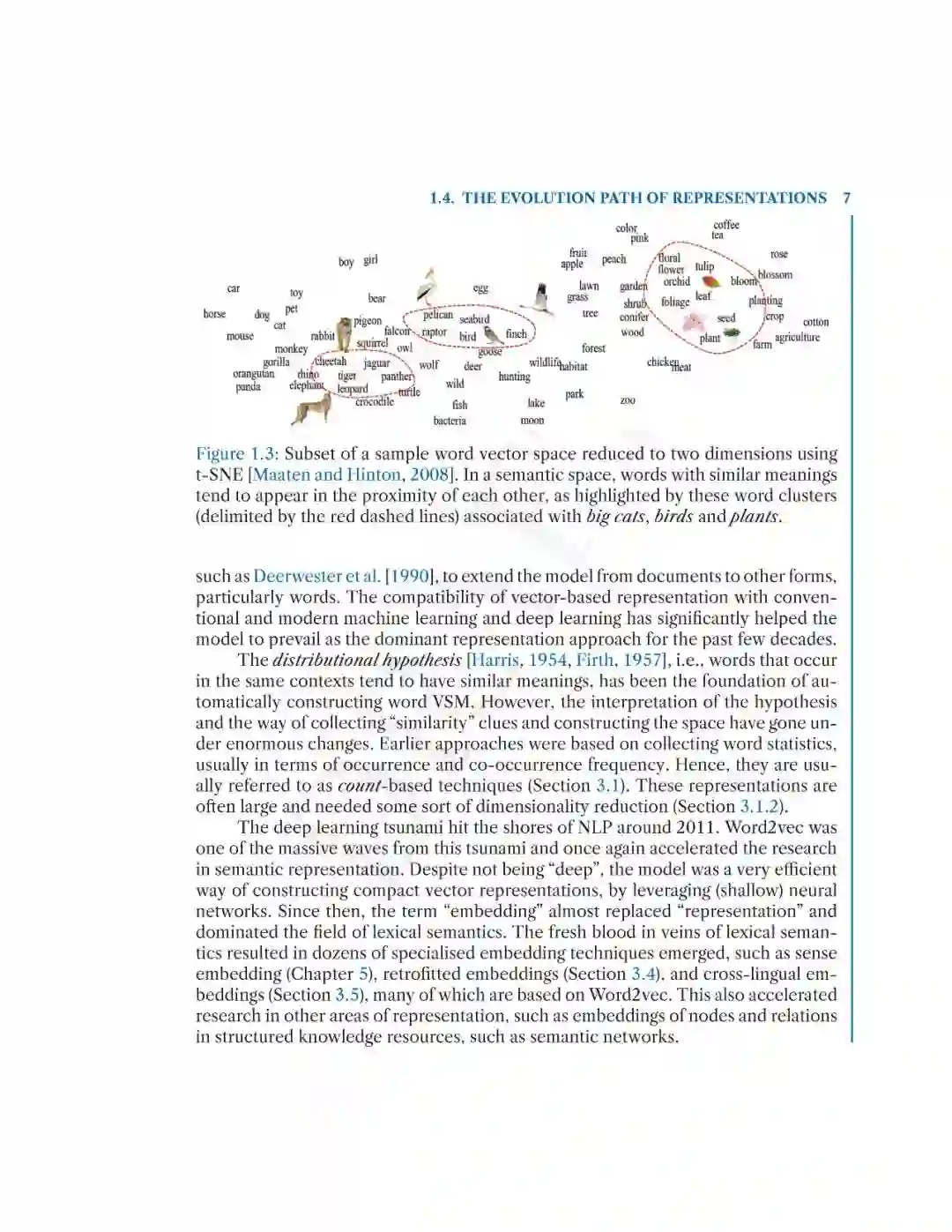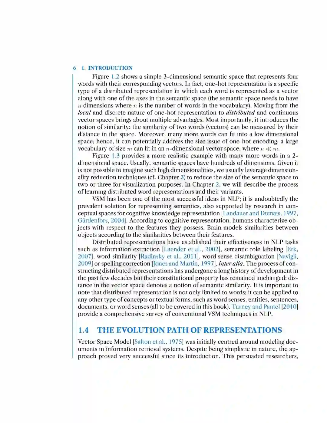 第3章讨论了单词表示,从传统的基于可数的模型的简要概述开始,接着是最近的基于预测的和基于字符的嵌入。在同一章中,我们还描述了一些专门用于嵌入的技术,例如跨语言单词嵌入,以及单词表示的通用评估方法。