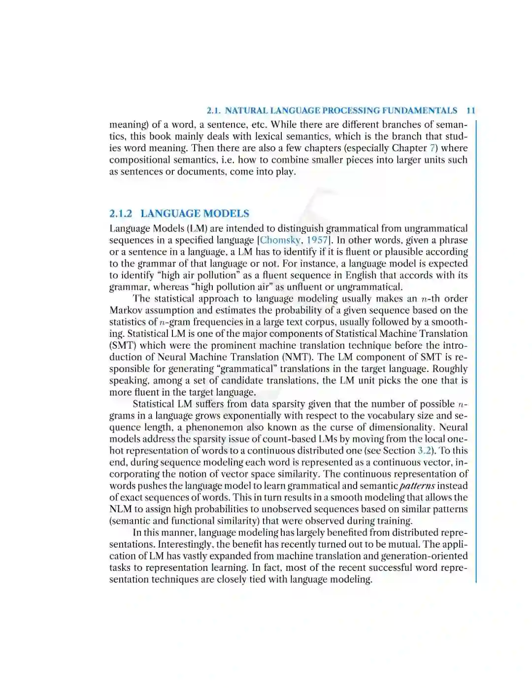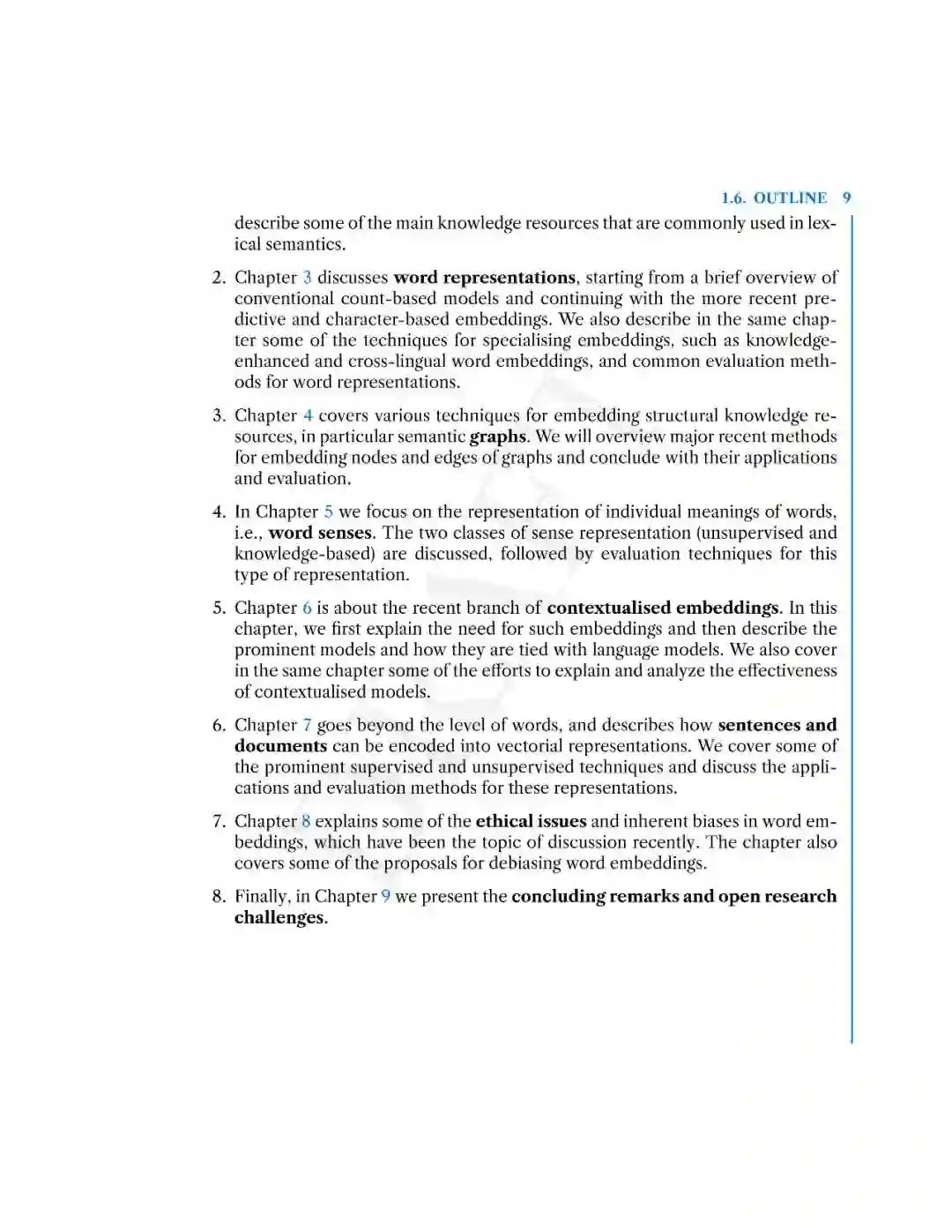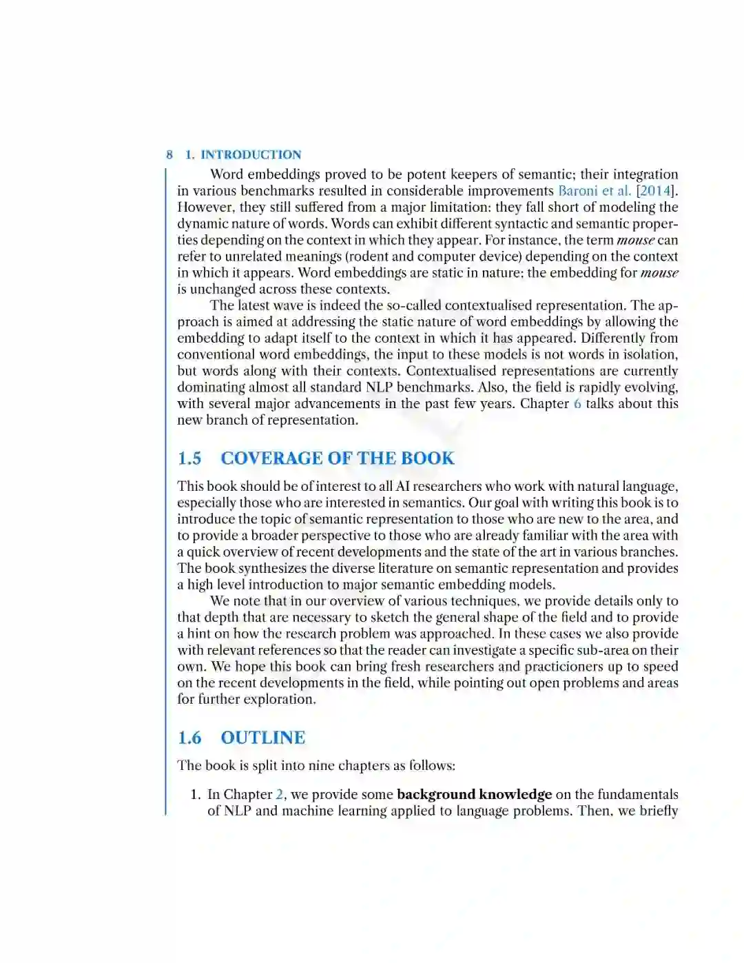 第六章是关于上下文嵌入的最新分支。在本章中,我们首先解释这种嵌入的必要性,然后描述主要的模型以及它们如何与语言模型相联系。在同一章中,我们还介绍了解释和分析上下文模型有效性的一些工作。