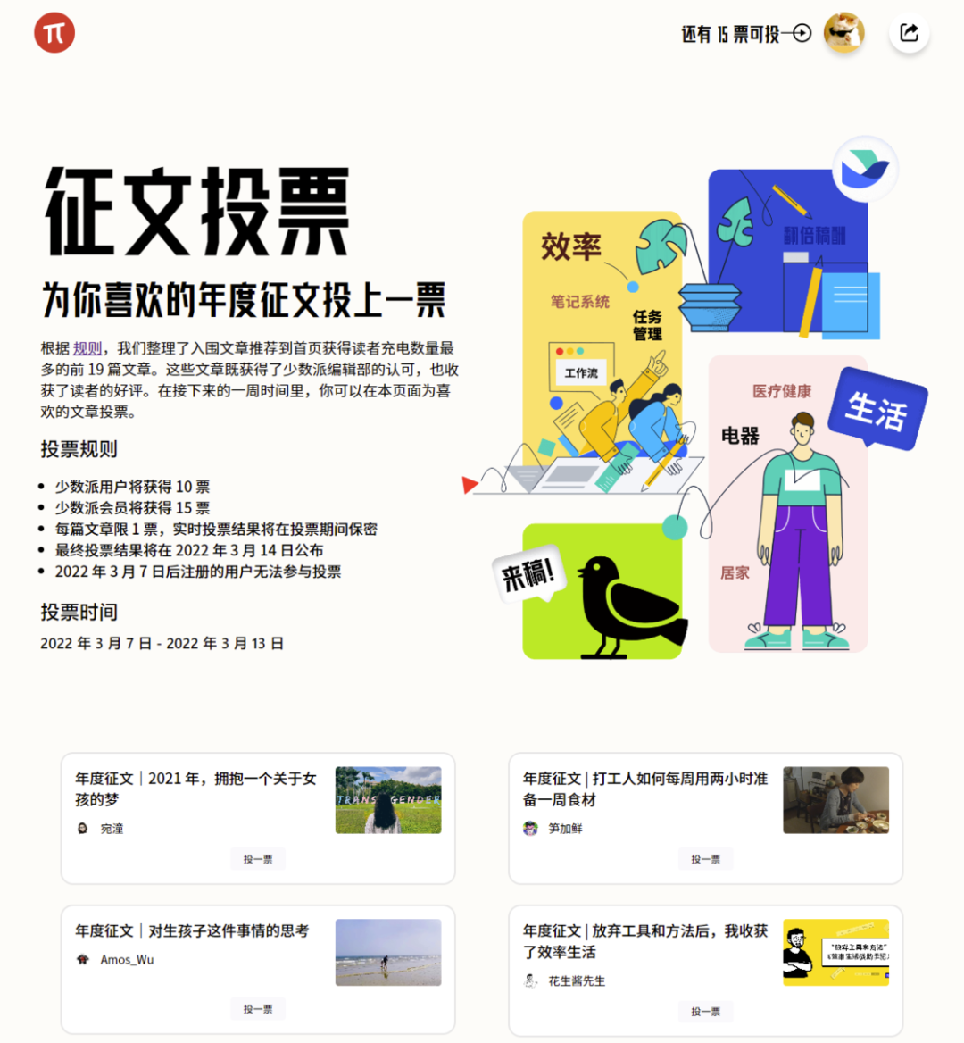 每位 2022 年 3 月 7 日前开通会员的少数派用户将 15 票