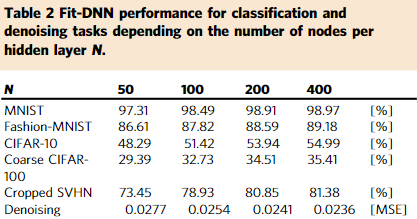 虽然这些结果显然不能与当下sota模型创造的性能记录相媲美,但它们是在一个新颖的、完全不同的架构上实现的。特别是,这里的Fit-DNN只使用了权重矩阵可用对角线的一半。对于测试的任务,增加N显然会导致性能的提高。