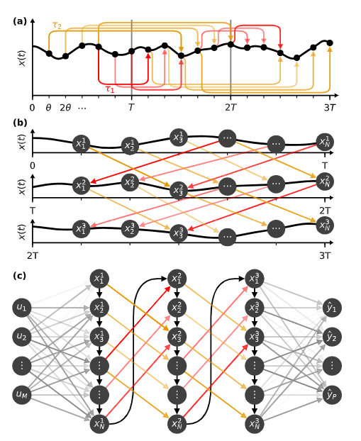 x(t)的时间演化可以分为长度为T的时间间隔,每个间隔模拟一个隐藏层。在每个区间中,选择N个点。使用一个具有小时间间隔θ的等距时间网格。对于有N个节点的隐藏层来说,可以得出θ=T/N。在每个时间网格点tn=nθ,将系统状态x(tn)作为一个独立变量。每个时间网格点tn将代表一个节点,而x(tn)代表其状态。可以进一步假设数据信号J(t)、偏置b(t)和调制信号Md(t)是步长为θ的步长函数。