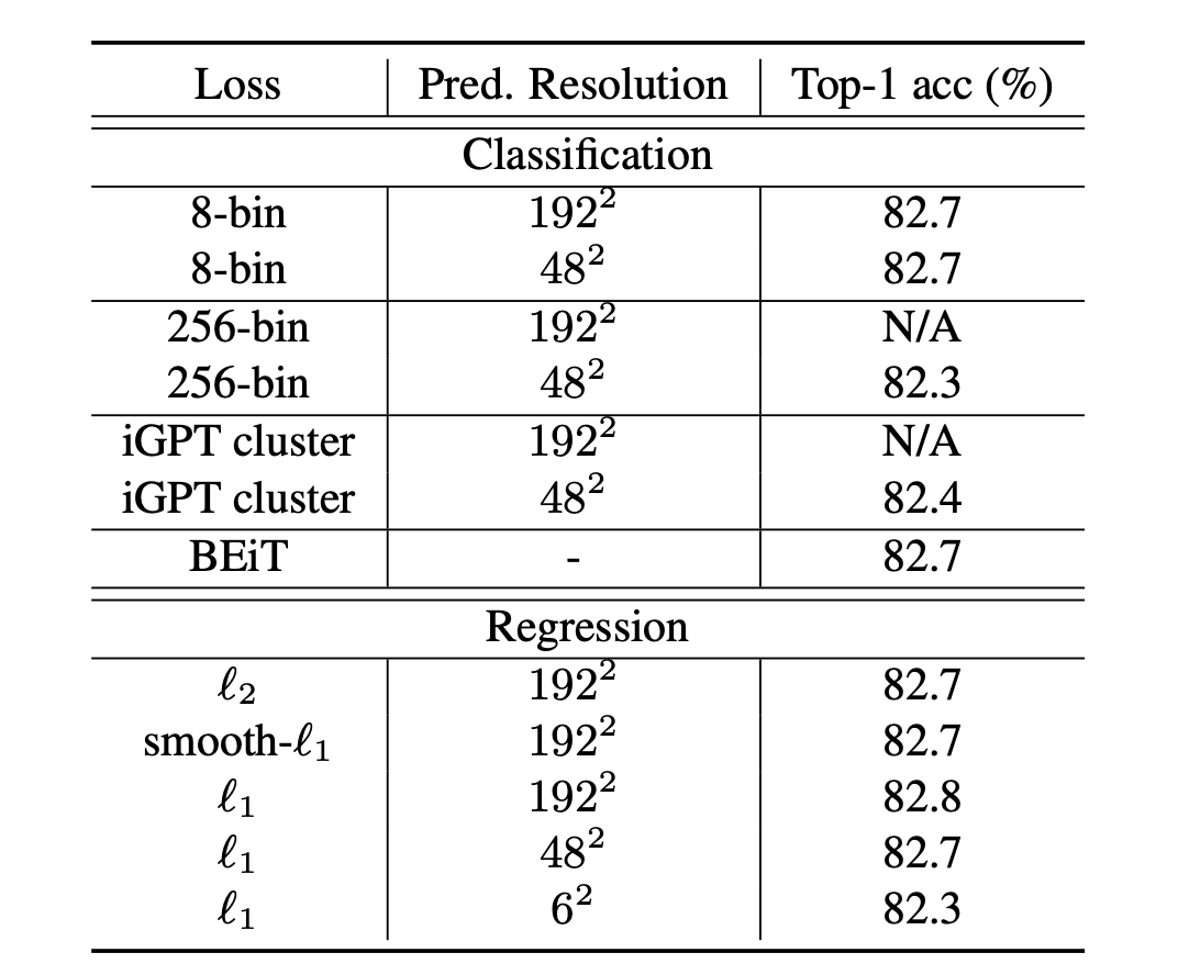 表 4 比较不同预测目标的效果。结果表明,掩码图像建模的目标不需要与掩码语言建模的分类目标一致。设计与视觉信号本身的性质保持一致的方法效果很好。