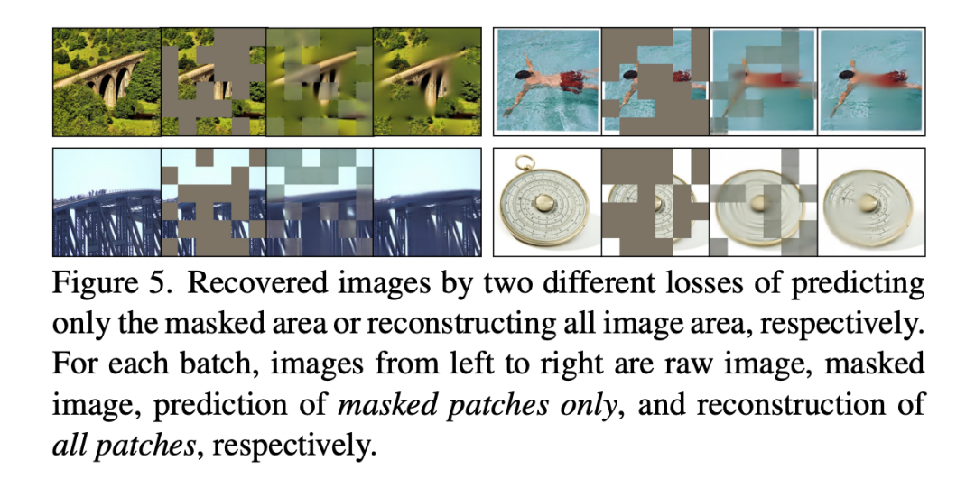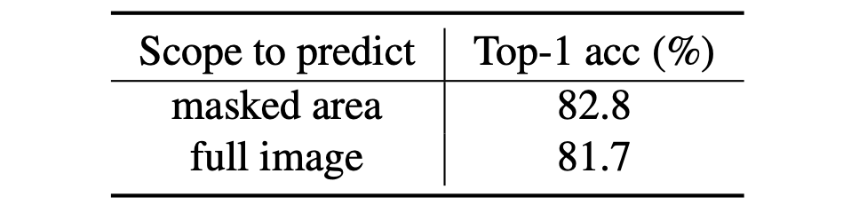 ▲ 表5. 对不同区域计算损失的消融结果。如果在掩码区域计算损失,则执行纯预测任务。如果对整个图像进行计算,则执行联合预测和重建任务
