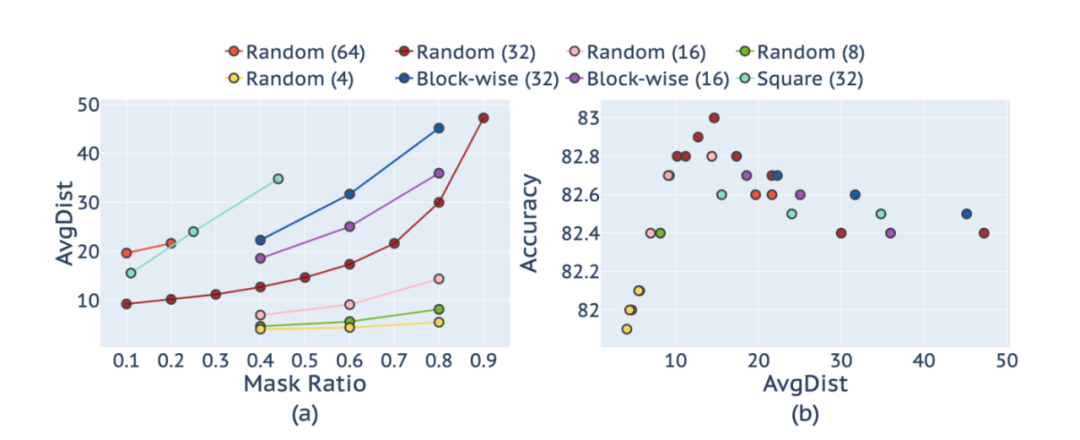 ▲ 图3. (a) 掩码率与 AvgDist 关系;(b) 最高的微调性能与 AvgDist 关系