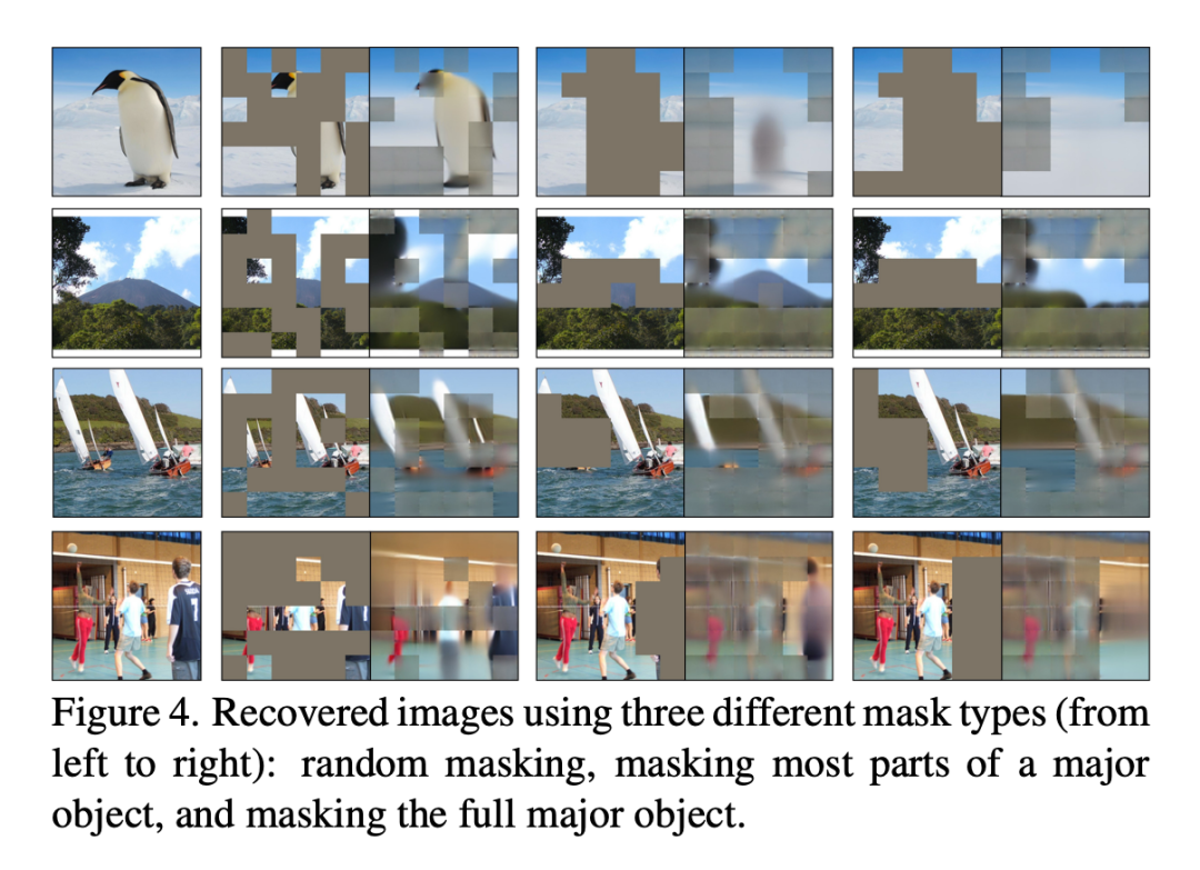 1. 采用中等大小的掩码块(如 32),对输入图像进行随机掩码,能使之成为强大的代理任务(pretext task);
