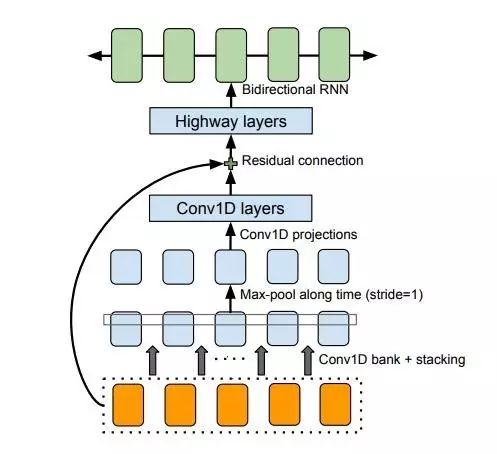 这里使用的 CBHG 模块是 state-of-art 的 seq2seq 模型,用在 Google 的机器翻译和语音合成中,结构如下: