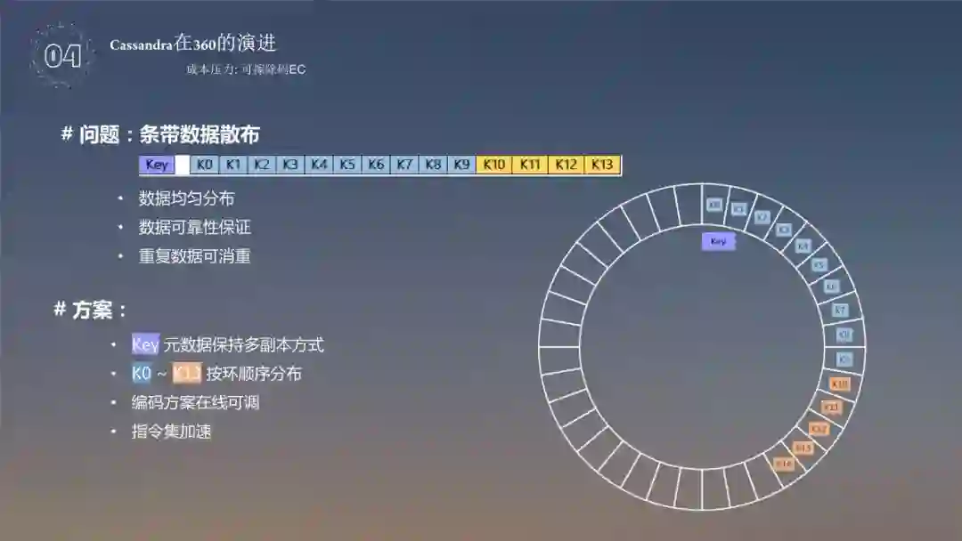 对于这个内容,EC 是把原有的数据进行块切分,算出校验块,然后校验块打散到整个集群中,如果丢失了几个块,可以用其他的10个块进行修复,再把分散的块 key 存储到 cfindex 的表中。对于前边的条带方式,主要使用切分 value,value 采用的是 512k 切成等份的4等份,可以得到4个校验块,需要全部打散到不同的数据块上,比如下图中的 k13,k14 不能放到一台机器上,这样才有意义,一旦数据丢失了,还可以方便恢复,如果四个块在一台机器上,坏了两台机器就没法恢复了,key 的数据有两部分,一个是元数据,一个是条带数据。元数据还是保持多副本的形式,但是算出来的条带数据实际上是按环分布,分成单副本的方式去存储,这样其实就可以达到三副本到1.4副本,编码可以在线调整,还可以使用指令集加速,通过指令集对 EC 进行加速,这块比较难的问题是如何把 Key 值分散在整个环上,而且还在不同的机器上,如果使用 Md5 算出来 value 值当作 key 值,还是有可能 Key 值存储在一台机器上,所以还是采用了 OrderPreservingPartitioner 保序的方式去存储。