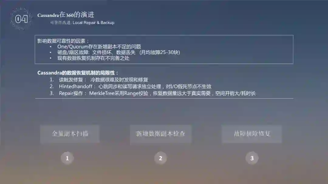 对于 Cassandra 的改进,第一个就是进行可靠性的改进,使用 Local Repair 跟 Backup。影响数据可靠性的因素有: