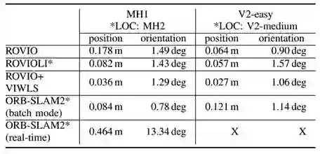 表1:EuRoC数据集[40]上的全局位置和方向RMSEs的ROVIO(仅VIO)),ROVIOLI使用其中一个数据集作为定位地图,以及ROVIO + VIWLS对应于全批视觉惯性最小二乘优化。 此外,比较了ORB-SLAM2 [25](批量和实时)的结果。ROVIO和ROVIOLI使用单目摄像头和IMU数据,而ORB-SLAM2使用立体摄像头。ORB-SLAM2的定位图已经建立在SLAM模式下,而定位评估已经在定位模式下进行。对于V2-medium,我们无法用如估计器分叉(estimator diverged)(用X标记)一样以ORB-SLAM2的实时模式构建地图。