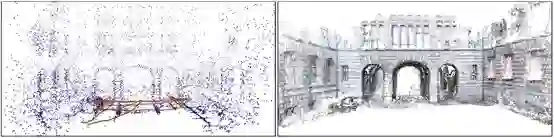 图8:maplab提供了两种不同的稠密重建工具。顶部:立体稠密重建用于基于灰度图像和优化的摄像机姿态来计算深度图。然后,他们融合在voxblox [38]创建一个表面网格进行融合。3个EuRoC数据集[4](MH1-3)相结合,创建一个对齐和优化的VI图。底部:CMVS / PMVS2 [39]重建结果基于一个单一的记录场景,使用一个RGB相机和多相机系统。