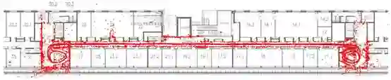 图1:maplab框架可以从多个建图场景中构建一致的视觉-惯性地图。在这里,4个独立的场景被合并和紧密结合。然后全局地图可以由里程计和定位前端使用,以纠正当重新访问该区域时发生的任何漂移。平面图覆盖了所有楼层的地标,显示了地图校准的准确性和一致性
