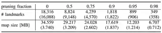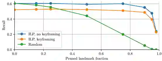图6:在ILP地标总结和关键帧+总结(landmark summarization and keyframing + summarization)(括号内)后的定位性能和地图大小。关键帧删除包括顶点-路标关联的顶点,有效地使地图更小。原始的地图有6,258个顶点,而关键帧图则包含760个关键帧。关键帧持续减少了少量百分比的召回,而总结只影响当修剪的标志性分数超过85%的质量【?】。 为了比较,我们提供了一个随机选择要删除的路标召回曲线【?】。