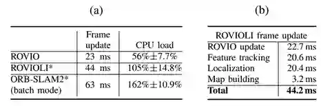 表II:(a)在20Hz处理的EuRoC MH1数据集上的ROVIO,ROVIOLI和ORB-SLAM2的时序和CPU负载。在ROVIOLI和ORB-SLAM2的情况下(用*标记),估计器被设置为根据由EuRoC MH2构建的地图进行定位。所有报告的值都是在Intel Xeon E3-1505M@2.8Ghz上测得的。800%的CPU负载对应于充分利用CPU的全部8个(逻辑)内核。(b)ROVIOLI独立块的单帧处理时间。由于他们并行运行,总时间并不对应于各个块的总和。相反,这个时间是完全处理单个帧所花费的时间。