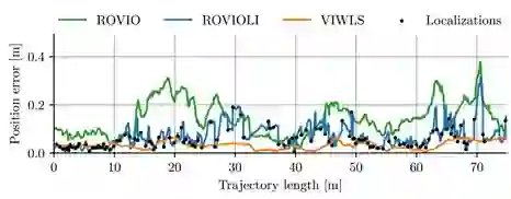 其次,该框架包含一个名为ROVIOLI的在线视觉-惯性建图和定位前端。它可以从原始的视觉和惯性传感器数据建立新的地图,并且如果提供定位图则追踪实时的全局(无漂移)姿态。以前的工作在不同的机器人平台上使用了这种能力,并展示了它能够准确跟踪包括导航和轨迹跟踪在内的多种应用的全局位姿。