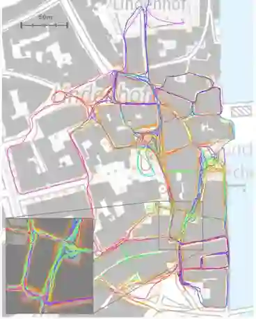 图7:苏黎世老城的大尺度多时段VI地图。使用Google Tango平板电脑在两个不同的日期(晴天和阴天)录制45个场景的原始视觉惯性数据。记录的总时间是231分钟。最终地图包含总长度为16.48公里的轨迹,435 K的地标,7.3 M的观测数据,大小为480 MB。 该地图可在maplab wiki页面上下载。