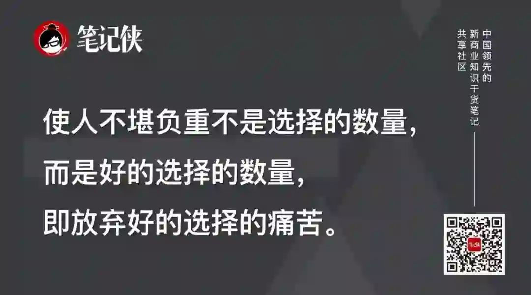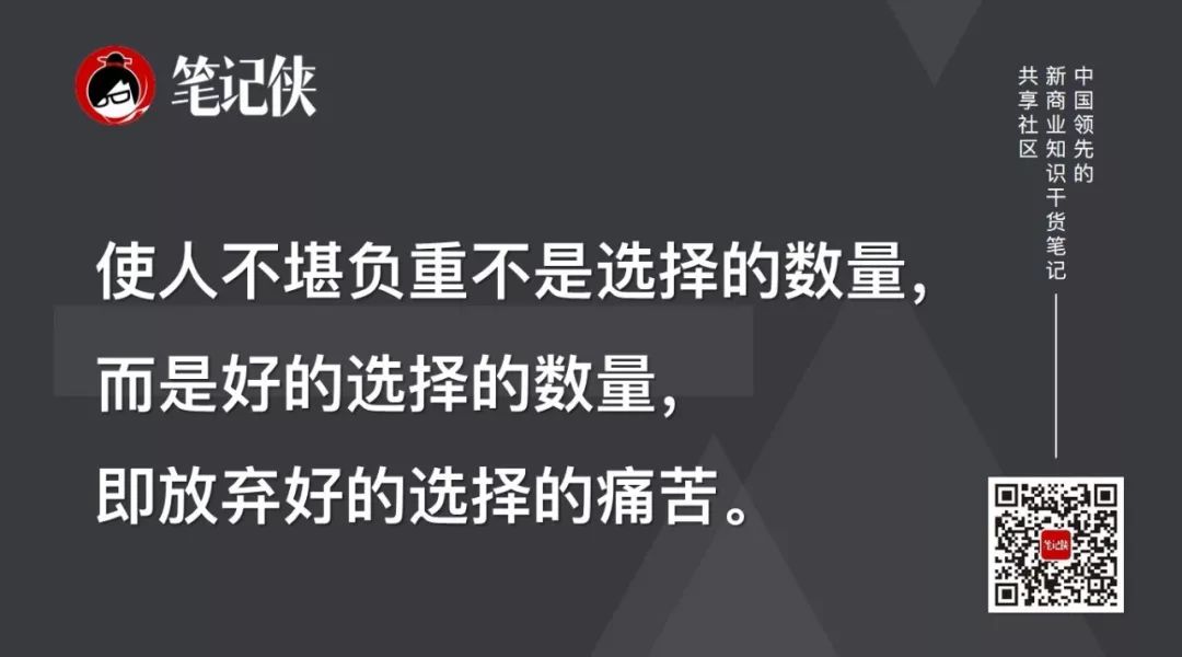 使人不堪负重不是选择的数量,而是好的选择的数量。放弃好的选择对人类来说是痛苦的,这就是所谓的损失厌恶。