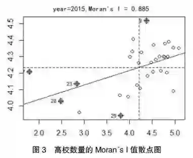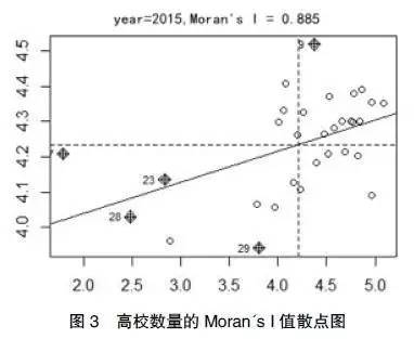 由此可见,全国范围内,各省域的高校分布并不是随机状态,而是表现出显著的正向空间自相关性,即拥有较多数量高校的省域,其相邻省域的高校数量也较多,反之亦然。因此,高等教育的发展在高校数量本身上就存在一定的空间集聚效应,一省域的高等教育发展能够带动其他省域的高校发展。考虑到高等教育对本省域经济增长的贡献,一省域高校数量对其他省域的经济增长必定也起到一定的影响(即空间溢出效应)。