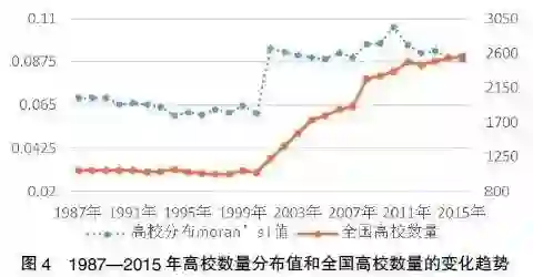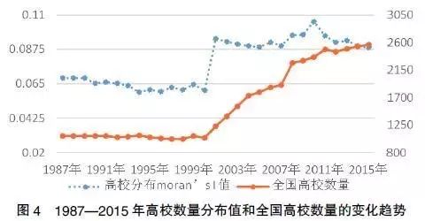 计算结果显示,1987—2015年间,我国省域间的高校分布均存在显著的正向空间自相关性(p值均小于0.01)。图3是2015年省域高校分布的散点图,从图中可以看出,我国高校分布在省域上绝大部分处于第一和第三象限。这说明我国高校分布在空间上呈现集聚现象,大多数省域为“高-高”集聚和“低-低”集聚。从动态发展角度来看,省域间高校分布的空间自相关性呈上升趋势,1987—2000年,指数值在0.06左右。2001年,受高考扩招的影响,全国高校数量显著增加,高校数量的也从0.0606陡然上升到0.942,并在之后逐年增高,到2010年达到峰值(0.1055),虽近年有所回落,但省域间高校分布的自相关性依然显著。(见图4)