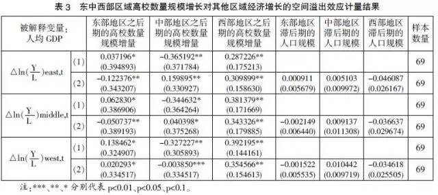 3. 流动性高等教育不公平导致区域间高校数量空间溢出效应的单向性。利用公式(3)对区域间高校数量增长的空间溢出效应进行研究发现,我国高校数量对经济增长呈西->中->东的方向性空间溢出。(见表3)具体来说,中部和西部地区的高校数量增长对东部区域经济增长起到正向的空间溢出效应,而东部高校数量增长对中部地区的经济增长、中部地区的高校数量增长对西部地区的经济增长产生负向的空间溢出效应。这是当前就业制度情况下,人力资本流动的单向性导致的。刘祖良认为,我国高校的非均衡发展分为对称性高校区域发展不均衡、非对称性高校区域发展不均衡和流动性高校区域发展不均衡。流动性高校区域发展不均衡是指由于区域间经济发展水平的不均衡和毛入学率的差异导致的人力资本由毛入学率低的区域流向毛入学率高的区域,由经济欠发达地区流向经济发达地区的现象。我国区域经济发展严重不均衡,人均GDP东中西部呈阶梯分布。东部地区制造业的集聚和第三产业的快速发展为劳动力提供了充足的优质就业岗位;同时,良好的职业发展前景、高额的职业报酬和优质的生活质量更是对中西部地区的优秀人才具有莫大的吸引力,致使“孔雀东南飞”现象屡见不鲜。