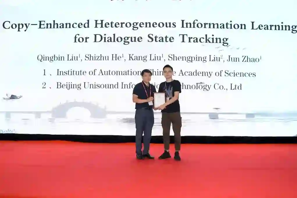 大会的中文最佳论文获得者为苏州大学的《基于简介文本的中文人物关系图谱属性补全与纠错》(杨一帆,马进,王海涛,何正球,陈文亮,张民),大会的英文最佳论文获得者为中科院自动化所和北京云知声信息技术有限公司共同署名的《Copy-Enhanced
