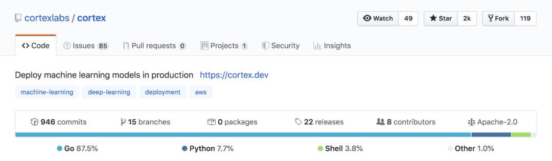 然而,在我们的Cortex(用于将机器学习模型部署成API的开源平台)代码库中,87.5%的代码都是Go。