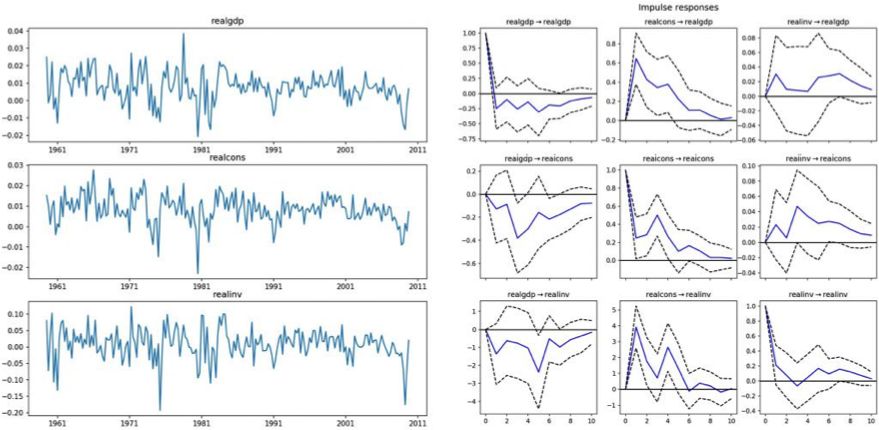 图 1:在三大金融指数上的 VAR 分析示例。左图是每个变量的时间序列,右图是最大为 10 个月的延后量的脉冲响应函数(IRF)。注意其中也包含了自响应。