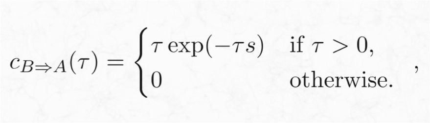 其中 τ 仍然是两个变量之间的时间延后量,而 s 则是脉冲响应的长度范围(这个函数的形状如下图中的红线所示)。为了我们当前的目的,这是一个任意的变量,我们只是随便选取了某个值。此外,我们假设这两个变量的内部动态都是 Ornstein-Uhlenbeck 过程,因此