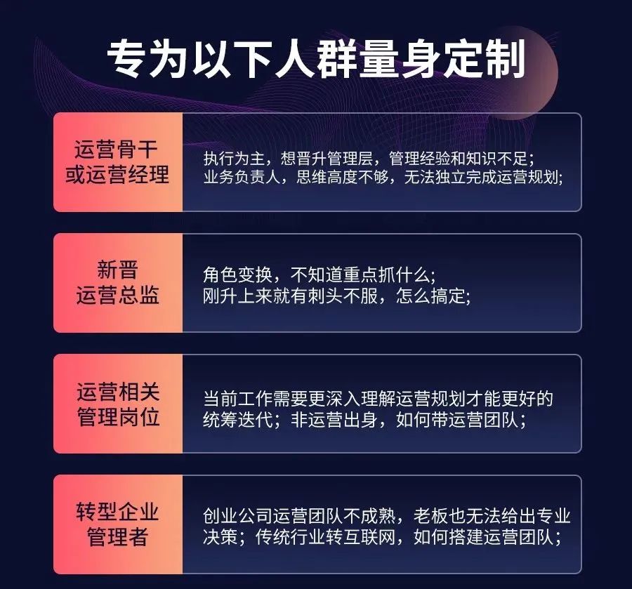课程为工作5年及以上的运营骨干、新晋运营负责人量身定制,旨在系统提升运营业务能力和团队管理水平,成为一位合格甚至优秀的运营管理者!