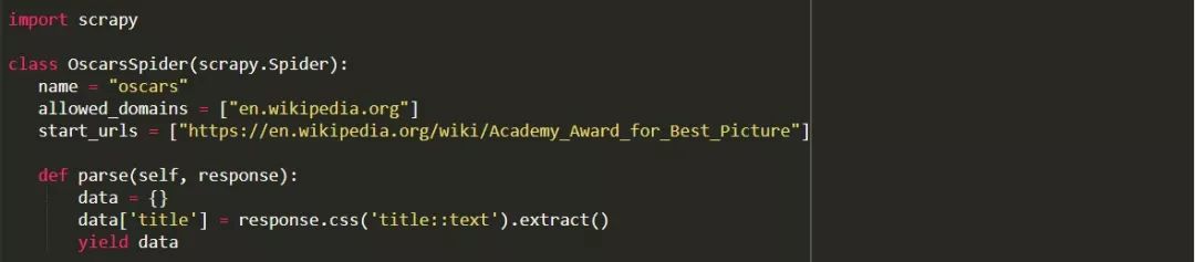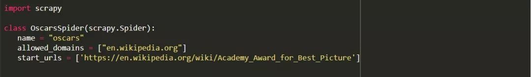 我们将从一个基本的蜘蛛开始。将以下代码输入到python脚本中。在文件夹/oscars/spiders中新建一个新的python脚本并命名为oscars_spider.py