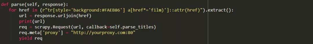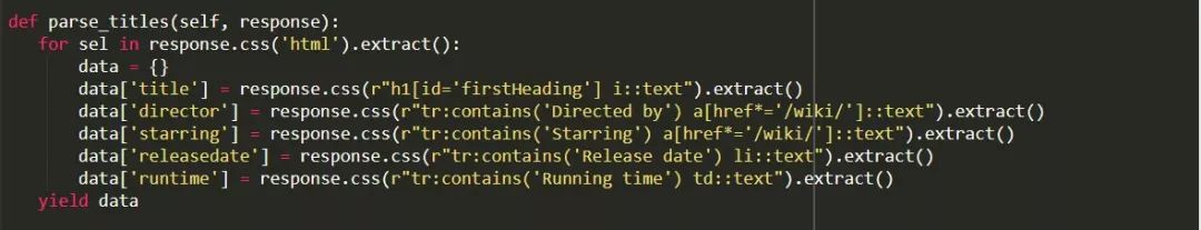 在这里,我们创建一个循环来查找页面中每一个以film)结尾、带有黄色背景的链接,然后我们将这些链接一起加入到URL列表中,我们将其发送到parse_titles函数以进一步传递。我们也会在计时器中输入它,每5秒钟只能请求一次页面。请记住,我们可以使用Scrapy shell来测试我们的response.css字段,以确保我们获得正确的数据!