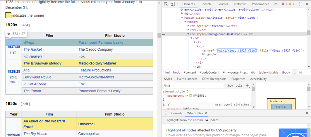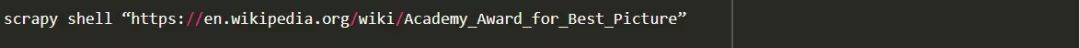 正如你所看到的,奥斯卡获奖者有黄色背景,而被提名者只有一个简单的背景。这还有关于电影标题的文章的链接,以及以film)为结束标记的电影链接。现在我们知道了这一点,我们可以使用CSS选择器来获取数据。在Scrapy shell中,输入: