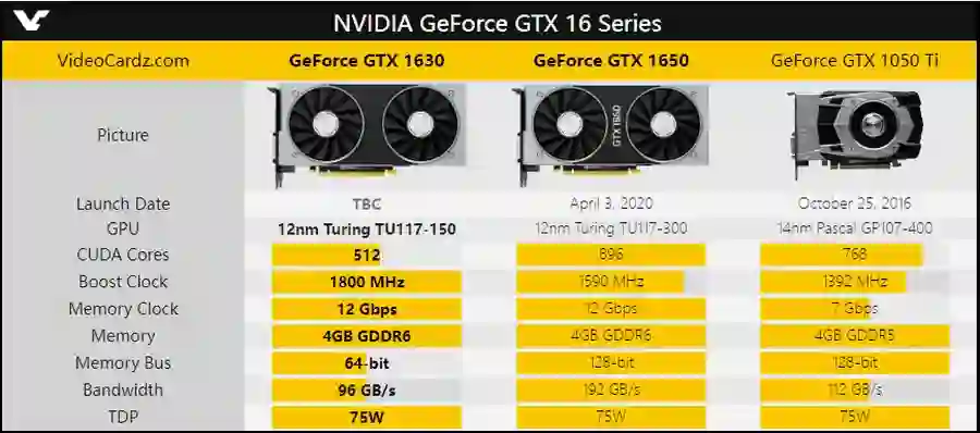 VideoCardz 报告称,GTX 1630 本质上是 GTX 1650 的精简版,GTX 1650 是 2019 年发布的入门级显卡。基于上一代 TU117-150 GPU(图灵架构),GTX 1630 的内核和内存总线比 GTX 1650 低。事实上两者似乎都减半了,GTX 1630 配备 512 个 CUDA 内核和 64 位内存总线以 12Gbps 的速度驱动 4GB GDDR6 vRAM。GTX 1630 拥有更快的 GPU 动态加速频率,与 GTX 1650 的 1665MHz 相比,高达 1800MHz。相同的 75W 功率,使其成为低功耗选项。