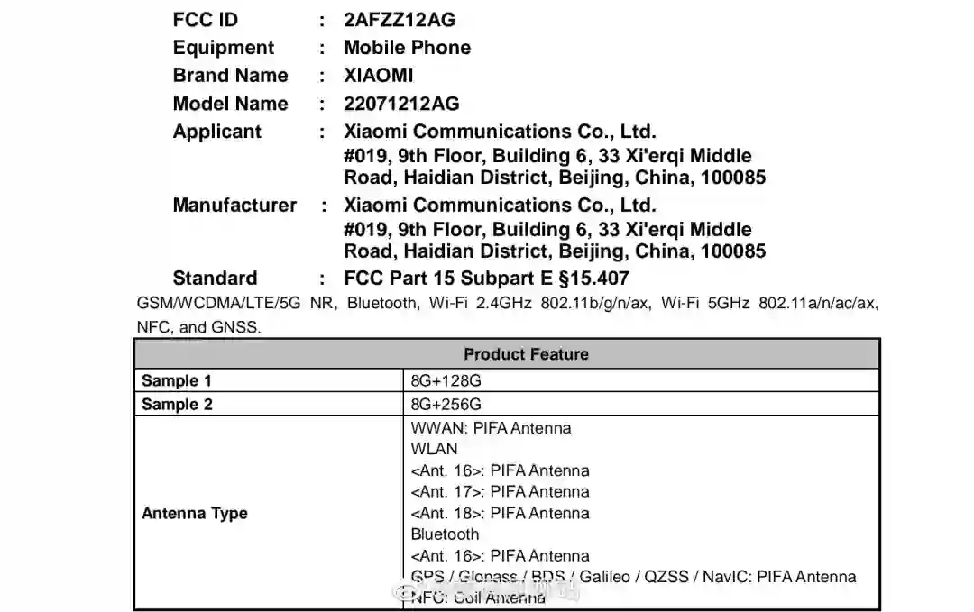 据此前消息,下个月开始会有大批量的骁龙 8+ 旗舰机型登场,各厂商都会有对应机型发布,而作为性价比王者 Redmi 也不会缺席。据 @数码闲聊站 最新爆料,Redmi旗下目前一款代号“22071212AG”(L12A)的机型已获得了 FCC 认证,NFC 红外 7 频 5G,国际版只备案了 8+128GB/256GB,预装 MIUI13 系统。