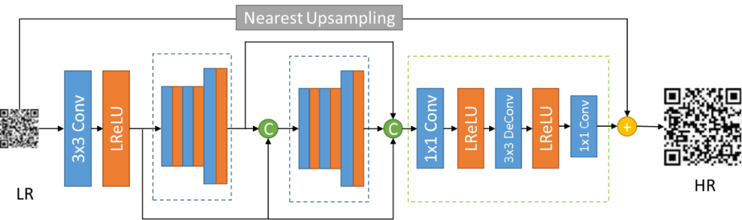 然而传统图像增强算法很难完美地解决以上问题,因此微信扫码引擎率先在识别流程中引入了基于深度学习的超分辨率技术(见图2)。