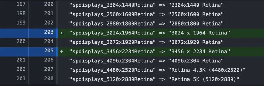 本周早些时候发布的macOS Monterey Beta 7,在System Information应用的显示分辨率列表中包括了两个新的条目,疑似曝光了即将推出的“M1X”14英寸和16英寸MacBook Pro机型的分辨率。MacRumors发现,这两款新的显示屏分辨率分别为“3456 x 2234 Retina”和“3024 x 1964 Retina”,与当前或以前任何苹果产品的内置显示屏分辨率都不相符。根据这些分辨率本身以及它们之间的关系,这些新的分辨率似乎是针对即将推出的MacBook Pro的。目前16英寸的MacBook Pro的原生显示分辨率为3072 x 1920,而目前13英寸的MacBook Pro的原生分辨率为2560 x 1600,这两款机器的像素密度都在226-227像素/英寸之间。 如果这些新分辨率确实适用于即将推出的MacBook Pro机型,那么像素密度将提高到250左右,这显然将允许将原生2x Retina作为这些新机器的默认设置,以获得尽可能清晰的图像。 虽然用户有多个显示分辨率选项可供选择,但目前的MacBook Pro机型具有可缩放的默认分辨率,介于原生显示分辨率和2倍Retina显示屏之间。 例如,目前的16英寸MacBook Pro的原生分辨率为3072 x 1920,相当于1536 x 960的真正视网膜质量,但这种16英寸对角线的显示屏上的内容对大多数用户来说似乎太大了,所以苹果出厂时默认的缩放分辨率“看起来”像1792 x 1120。随着像素密度明显增加,真正的2x Retina设置对于大多数用户来说恰到好处,16英寸机型的分辨率为1728x1117,14英寸机型的分辨率为1512x982。