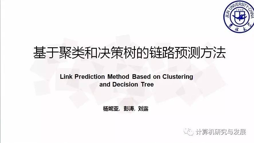 杨妮亚,彭涛,刘露. 基于聚类和决策树的链路预测方法[J]. 计算机研究与发展, 2017, 54(8): 1795-1803.