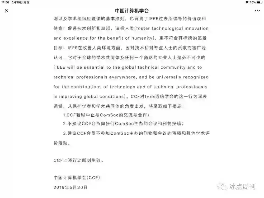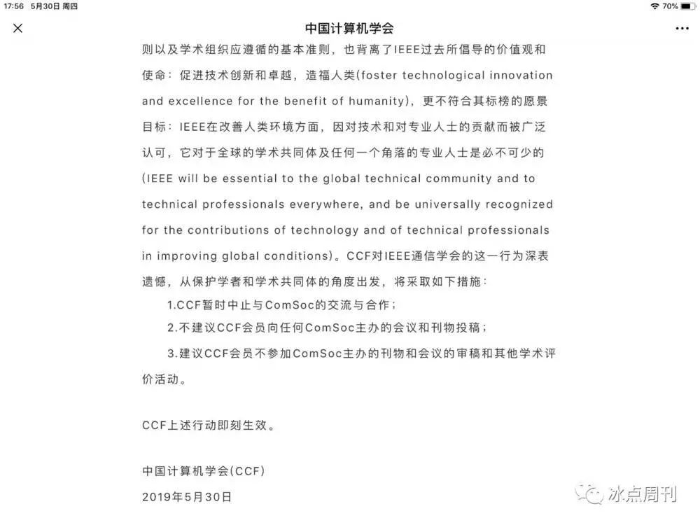 中国计算机学会(简称CCF)今天发表“关于IEEE通信学会不当行为的声明”,表示暂时中止与IEEE通信学会的交流与合作。
