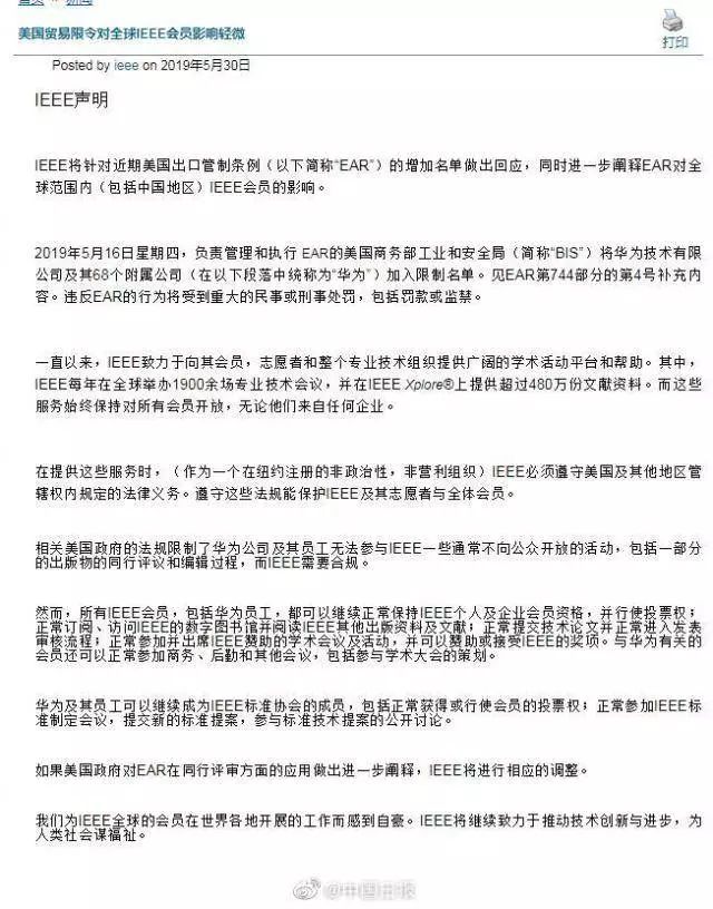 今晨,IEEE中文官网发布声明称:“美国政府的法规限制了华为公司及其员工无法参与IEEE一些通常不向公众开放的活动,包括一部分的出版物的同行评议和编辑过程,而IEEE需要合规。”