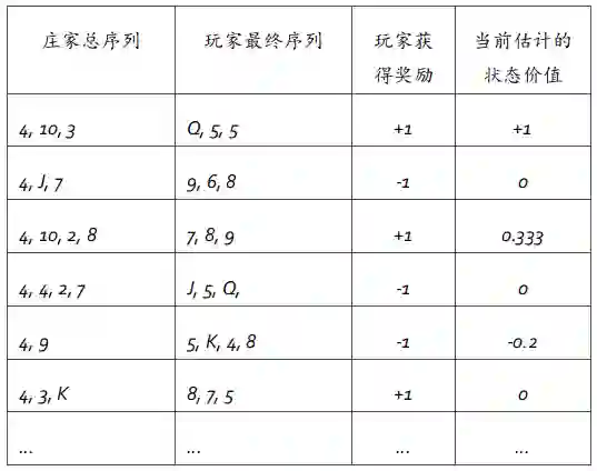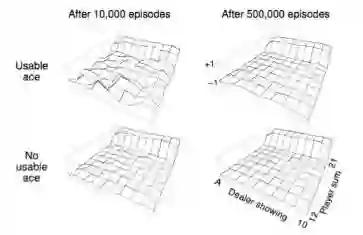 可以看到,使用只有当牌不小于20的时候才停止叫牌这个策略,前6次平均价值为0,如果玩的牌局足够多,按照这样的方法可以针对每一个状态(庄家第一张明牌,玩家手中前两张牌分值合计)都可以制作这样一张表,进而计算玩家奖励的平均值。通过结果,可以发现这个策略并不能带来很高的玩家奖励。